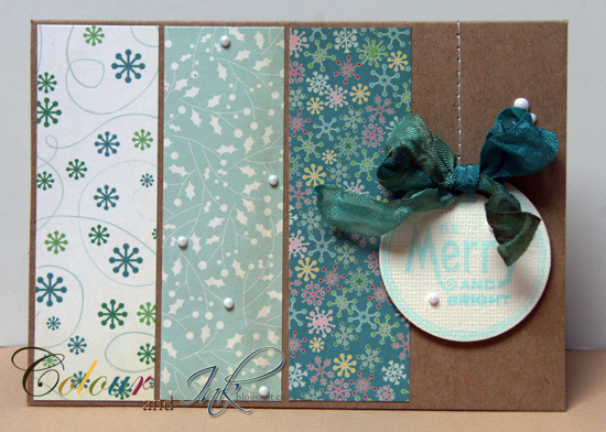 My first holiday card of the season! I used papers from a 6x6 Cosmo Cricket Pad - Jolly by Golly. I stamped the sentiment on cream textured cardstock with chalk ink (very difficult to photograph well!). Added machine stitching to "attach" the bauble to the card. Beautiful distressed ribbon by MemrieMare finishes off the card.